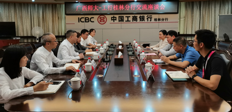 李英利代表学校感谢交通银行桂林分行、工商银行桂林分行长期以来对广西师范大学的大力支持,并介绍了学校发展情况和90周年校庆筹备情况。在认真听取企业负责人的介绍后李英利表示,长期以来学校与银行开展了深入而广泛的交流合作,取得了丰硕成果,建立了深厚的友谊。他希望以此次交流为契机,更好的拓宽与各银行的合作空间,搭建合作平台,充分发挥资源优势,拓宽就业渠道,建立长效机制,共同构建产教融合高质量人才培养体系,协同育人,促进更深层次的互动。