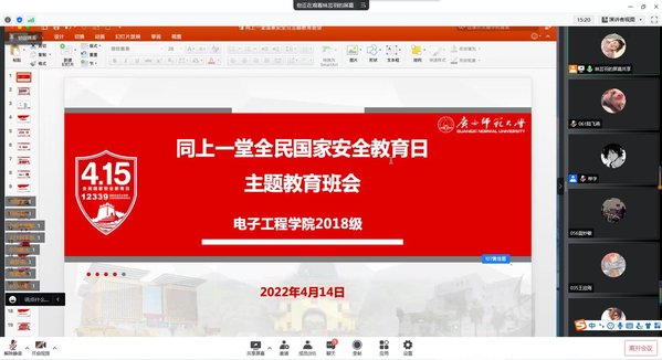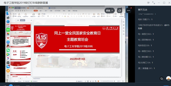 4月14日,学院组织学生以宿舍小组、个人自学等形式观看了“千万师生同上一堂国家安全教育课”为主题的国家安全宣传教育线上直播节目。4月15日,各年级在辅导员老师的组织下,通过线下集中或线上钉钉群形式开展国家安全教育主题班会,当天,同学们还参加了易班专题知识打卡活动和微博短视频学习等。