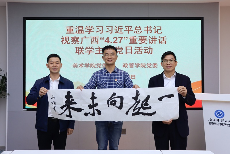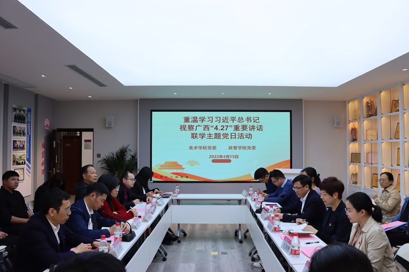 在习近平总书记视察广西一周年之际,为深入学习贯彻习近平新时代中国特色社会主义思想,牢记领袖嘱托,汇聚奋进力量,4月15日,政管学院党委、美术学院党委在雁山校区起文楼474全国党建样板支部党员活动室开展“重温学习习近平总书记视察广西‘4.27’重要讲话”联学共建主题党日活动。政管学院和美术学院领导班子、党委委员、纪委委员、党支部书记及教师代表共23人参加活动。