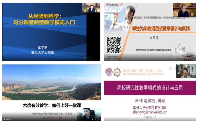 为进一步提升我校教师教学设计能力、教学模式创新和教学信息化技能,教务处/教师教学发展中心于4月16至17日组织开展“高校教师教学设计、方法、模式深度融合实操及核心能力锤炼”线上专题培训。本次培训采取线上直播形式,由复旦大学张学新教授、陕西师范大学何聚厚教授、湖南师范大学罗繁荣主任、南开大学张伟刚教授四位专家主讲,各学院(部)共150余名教师参加培训。