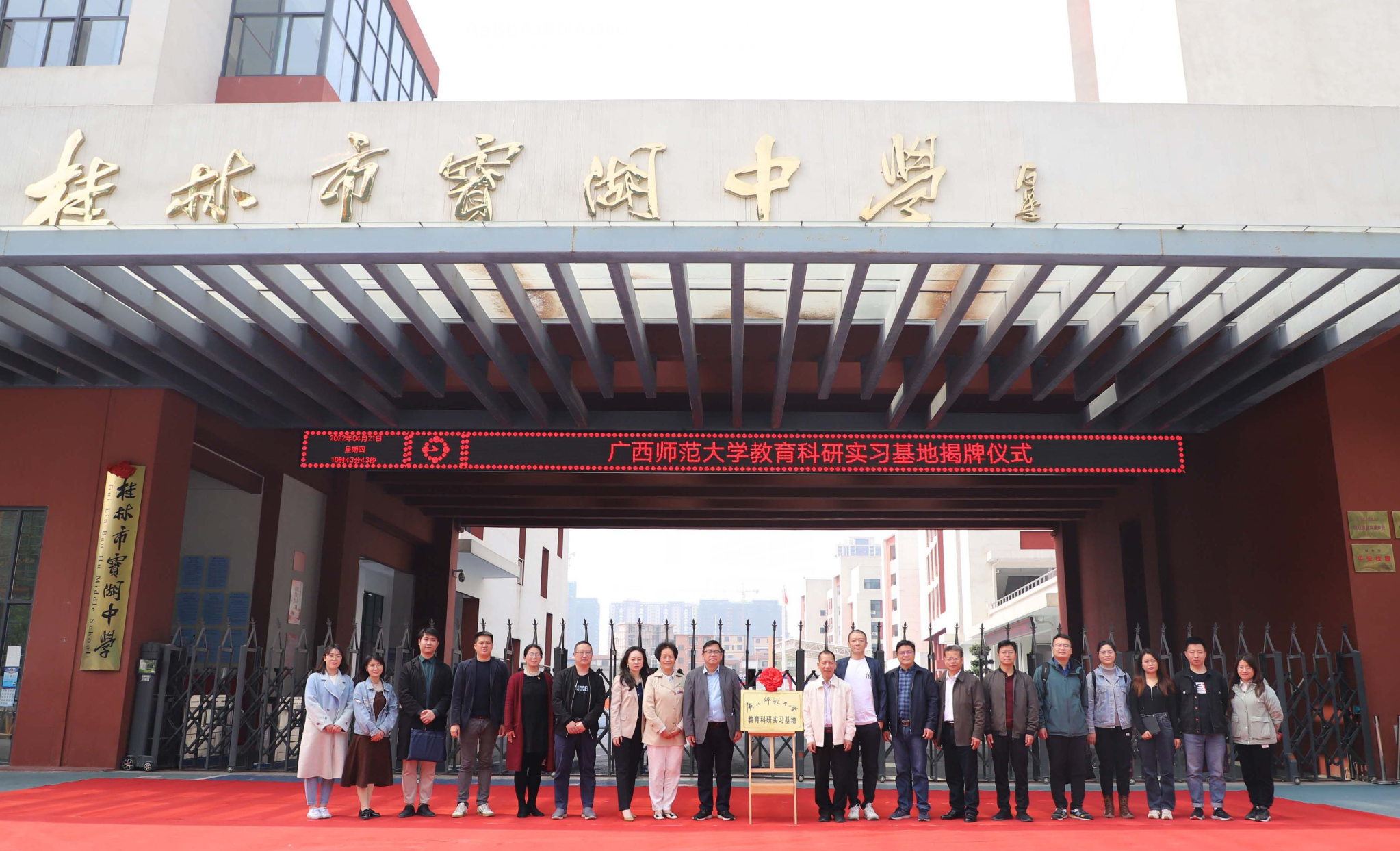 学院访企一行接着前往桂林宝湖中学举行“广西师范大学教育科研实习基地”揭牌仪式并进行座谈。