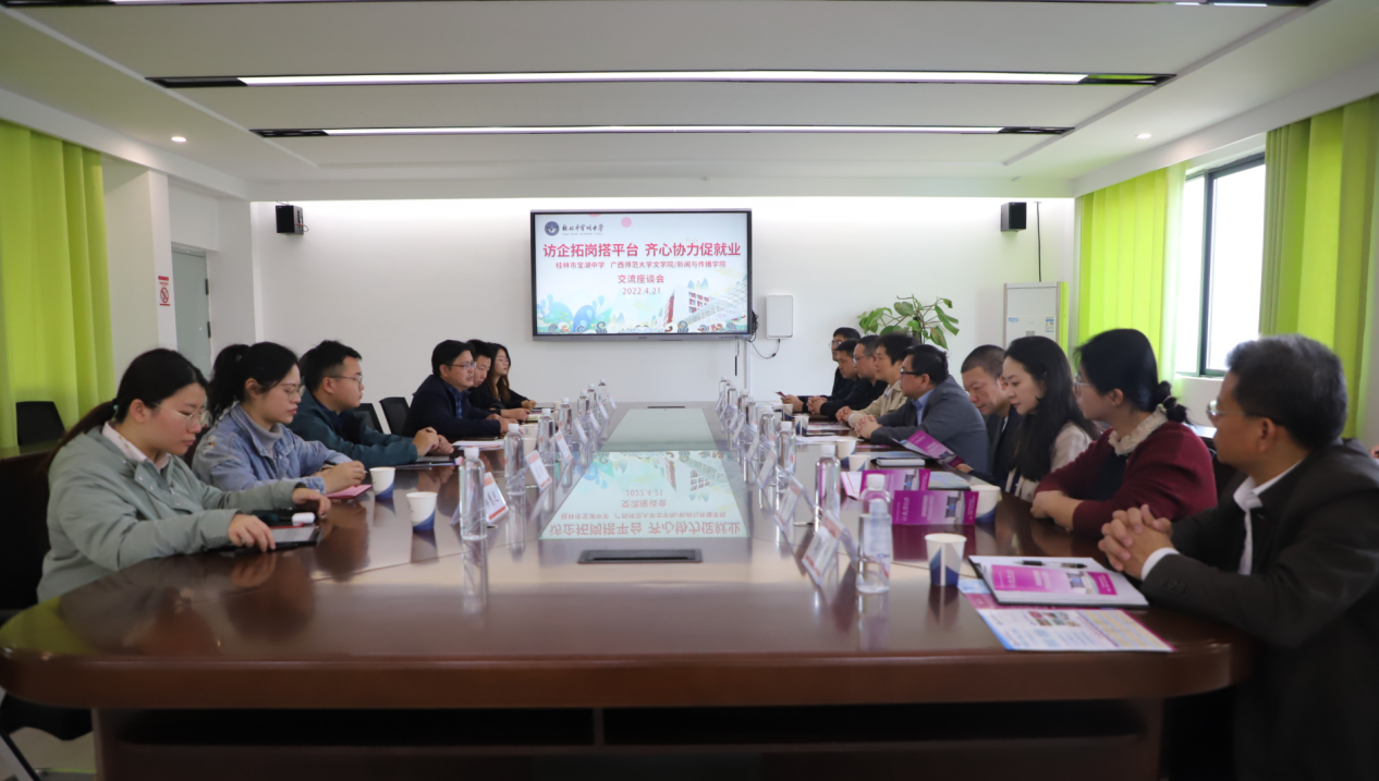 为深入贯彻落实习近平总书记关于做好高校毕业生就业工作的重要指示精神,按照党中央、国务院,自治区党委、政府关于高校毕业生就业工作的决策部署,进一步加强就业市场建设,在接到《广西师范大学书记校长访企拓岗促就业专项行动方案》通知后,根据相关精神,文学院/新闻与传播学院立即启动“访企拓岗促就业”专项行动,学院党委负责人、纪委负责人带领学院全体毕业班辅导员于4月21日到访广西师范大学出版社集团(以下简称“出版社集团”)、桂林市宝湖中学开展交流座谈。