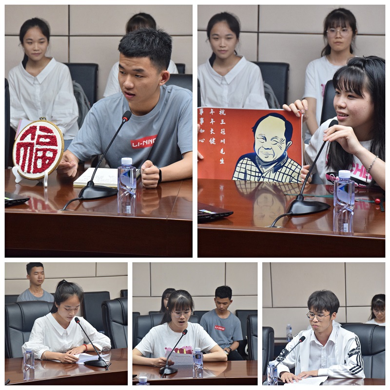来自文学院/新闻与传播学院、政治与公共管理学院、计算机科学与工程学院/软件学院的3位同学发表获助感言,他们纷纷表达对“小王哥”诚挚的感激,并表示要发扬“小王哥”助学济困的精神,传递“王助”大爱。来自设计学院的2位同学运用专业所学知识为王冠川先生精心准备感谢礼物。