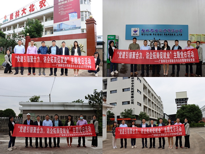 政管学院一行先后走访了桂林大北农饲料有限公司、桂林彤强新型建材有限公司、桂林市中天机械有限公司和桂林福桂纸业有限公司等四家企业,并就毕业生就业、学生实习、人才培养、政企校合作等方面进行了交流座谈。四家企业相关负责人分别就企业发展历程、规模、前景,企业文化,员工职业发展,以及企业用人需求和人才招聘计划等内容进行了详细介绍,并表示希望能通过党建引领的方式,创新合作模式,搭建校外实习基地,聘请校外企业指导老师,将第一课堂与第二课堂有机融合,共同深入推进校企合作平台建设,实现资源共享。
