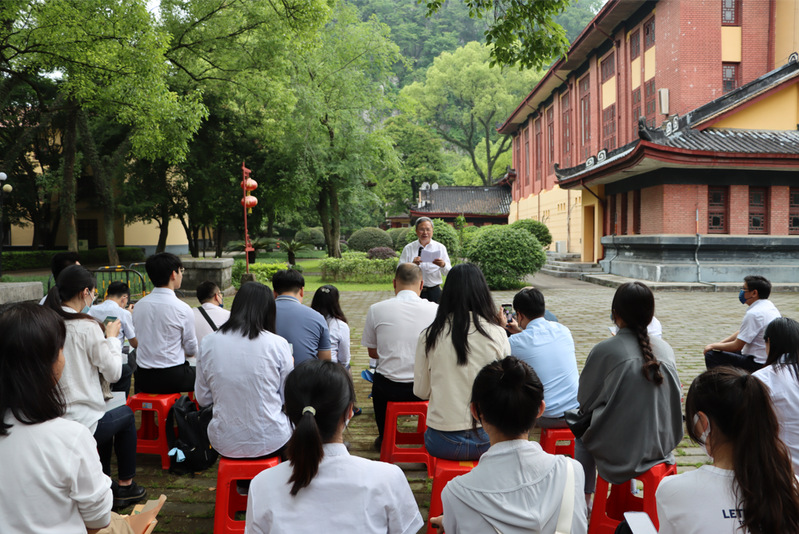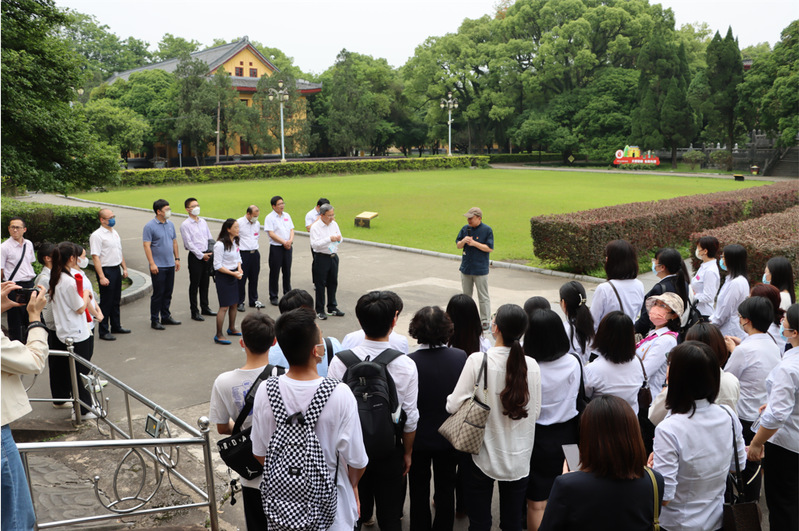 唐凌教授以习近平总书记关于“要加强校史资料的挖掘、整理和研究,讲好中国共产党的故事”的讲话精神要点进行现场教学。在唐凌教授的带领下,大家沿着王城承运殿、国学堂、中山纪念碑等逐步践履,他向大家分别讲述了王城的历史沿革、变迁,孙中山与马林在王城的会见及其对第一次国共合作的影响。唐凌教授指出,桂林王城是广西师范大学第三个使用过的校区,承载着厚重的历史,既是国际共产主义运动的活动场所之一,也是国共合作的重要发源地之一。了解身边的历史文化资源,不仅有利于增强文化自信,还能有效开辟国际文化传播途径。