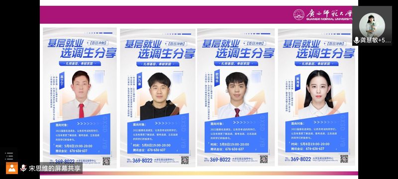 为更好推进我校2022届毕业生基层就业工作,发挥我校选调生就业典型的引领示范作用,帮助学生坚定理想信念、扎根基层、奉献祖国,促进毕业生更加充分更高质量就业。5月8日,我校成功举办第一期“基层就业——选调生分享”,本次分享会采用腾讯会议进行,邀请了4位毕业于我校且顺利考取选调生的校友进行分享。
