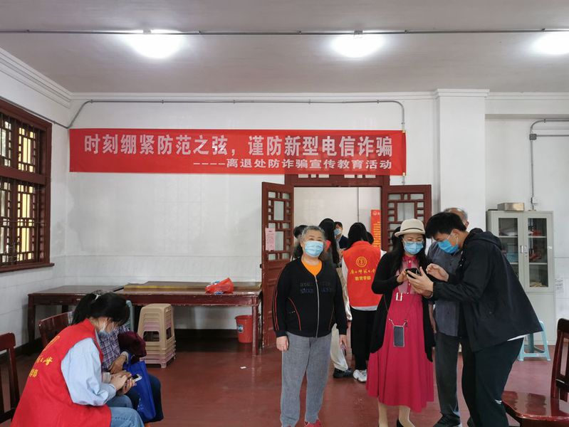 为贯彻落实中办、国办印发的《关于加强打击治理电信网络诈骗违法犯罪工作的意见》,提高我校老同志反诈骗能力,5月17-20日,离退处联合桂林市秀峰分局百梓派出所、我校教育学部小太阳党员志愿者在王城、育才校区开展防诈骗宣传教育活动,离退休教职工踊跃参加,共有近700人参加了活动,年纪最长者102岁。