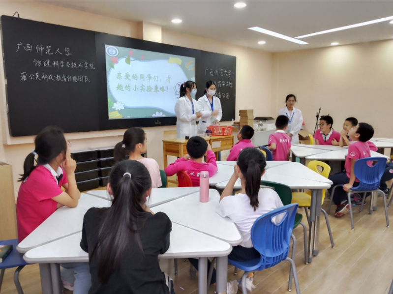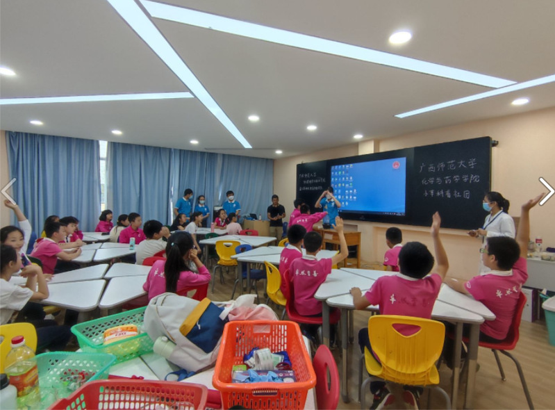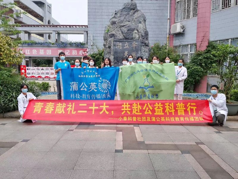 为充分发挥青年大学生志愿服务能力,让科学实验走进中小学课堂,更好地激发中小学生学习科学的热情,提高中小学生的科学素养,引导学生们树立讲科学、爱科学、学科学、用科学的志向,5月20日,化学与药学学院小草科普(以下简称“小草”)团队联动物理科学与技术学院蒲公英科技教育传播团队前往桂林市卓然小学开展“青春献礼二十大,共赴公益科普行”活动。