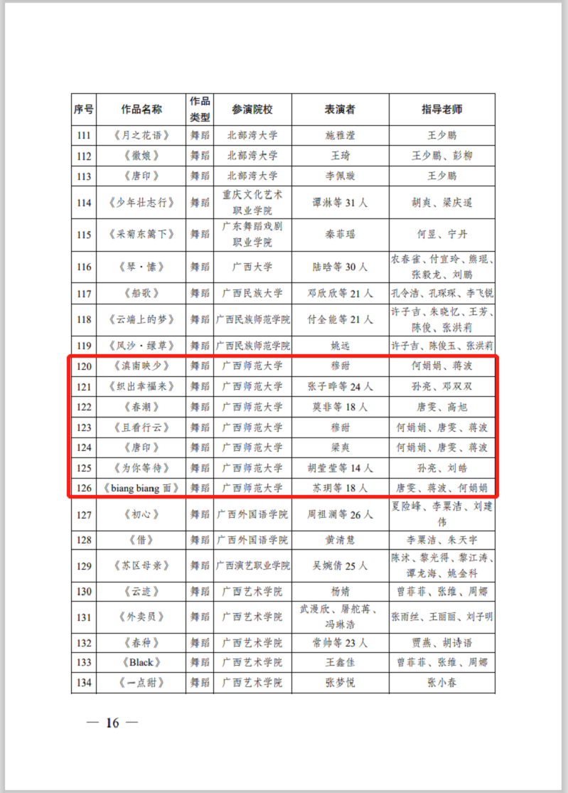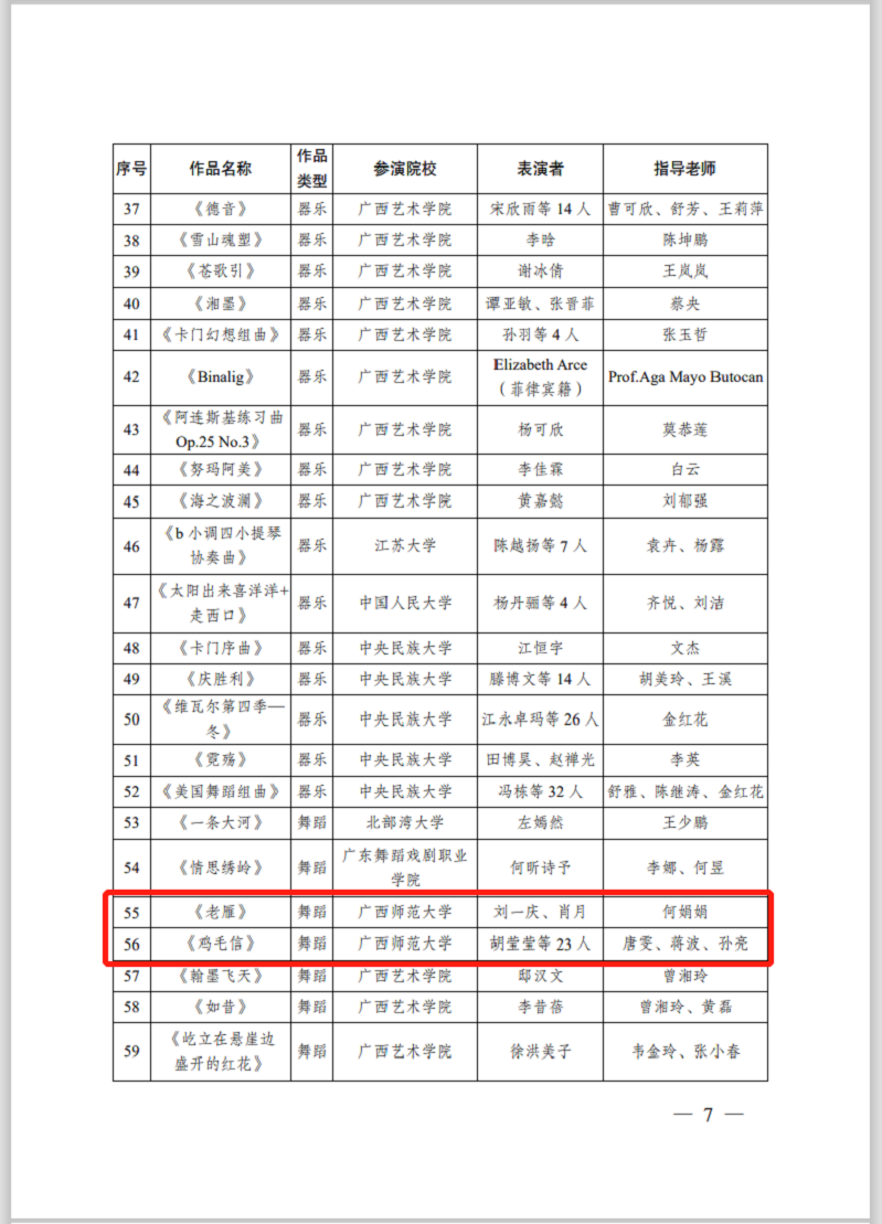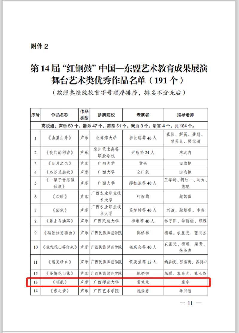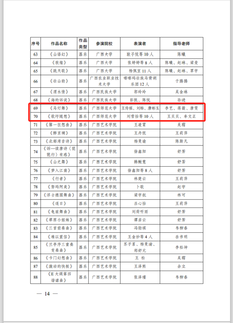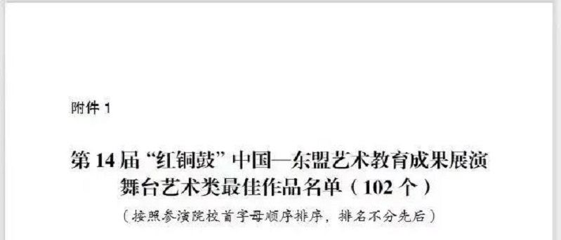 由中华人民共和国文化和旅游部科技教育司指导,广西壮族自治区文化和旅游厅、广西壮族自治区教育厅主办的第14届“红铜鼓”中国—东盟艺术教育成果展演活动将于6月在线上举行。本届展演活动共有79所国内院校报名参加,音乐学院在本次展演评选中喜获佳绩,选送的作品在4682件(个)报送作品中脱颖而出,分别荣获舞台艺术类最佳作品奖两项、优秀作品奖十项。特此喜报!