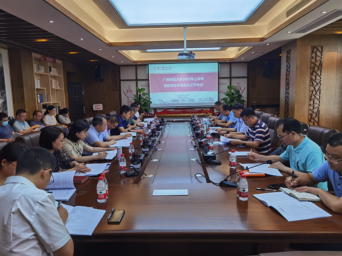 网络信息中心主要负责人通报了学校2022年信息化建设的重点工作、学校网络建设(含有线和无线)的基本情况、2022年1-5月网络安全情况和“一网通办”平台建设进度等情况,并对需要审议的《广西师范大学数据治理与共享建设方案》、《广西师范大学主页建设管理办法》等网络安全和信息化工作文件进行了简要介绍。