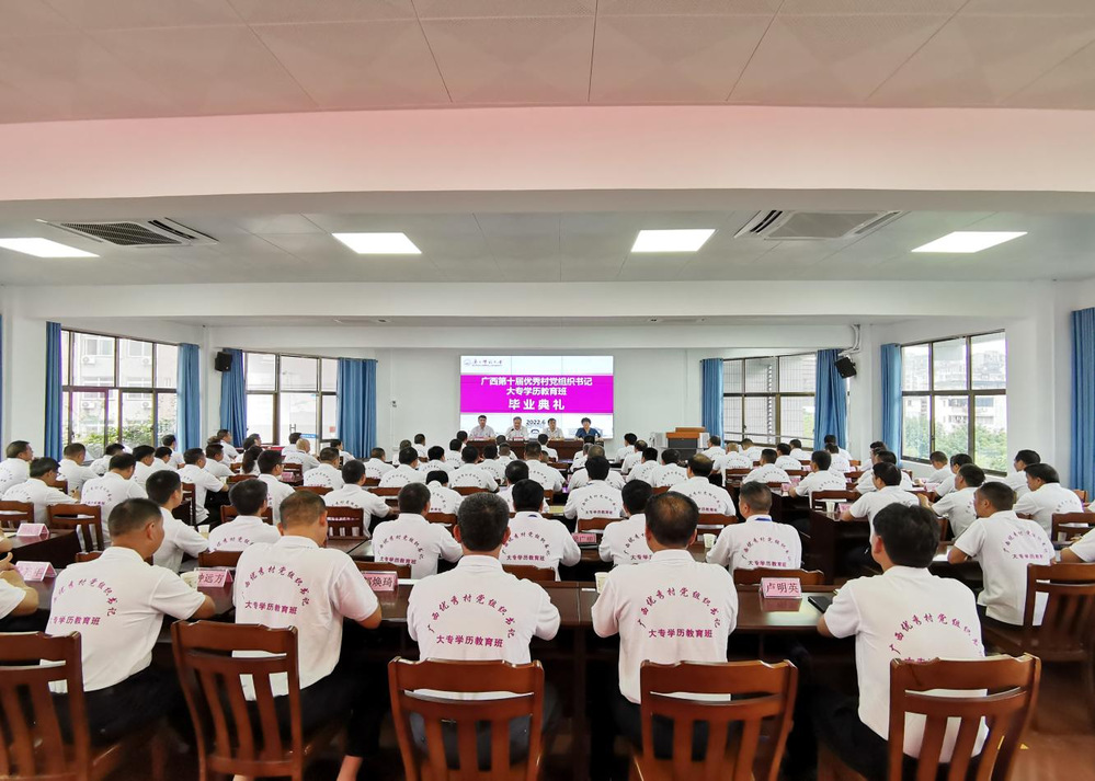 6月19日,广西第十届优秀村党组织书记大专学历教育班毕业典礼在我校举行。副校长苏桂发、自治区党委组织部组织三处副处长、基层办副主任於志宏、我校继续教育学院相关负责人出席毕业典礼。来自桂林、柳州、梧州、来宾、贺州、河池、贵港等7个地市的近100名优秀村党组织书记参加了毕业典礼。