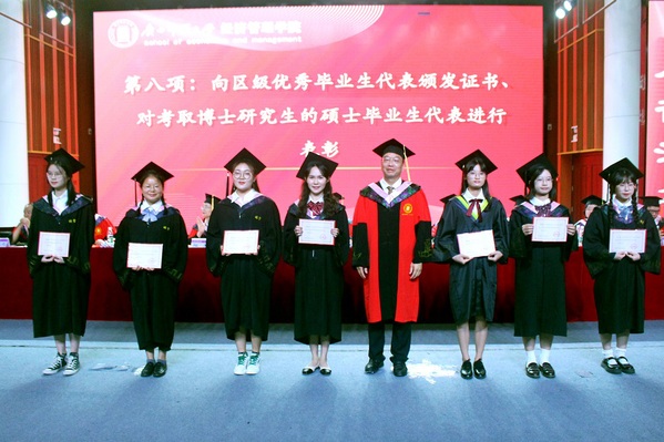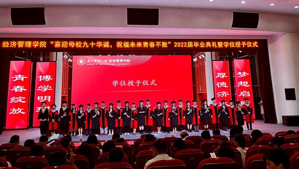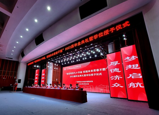 6月26日,经济管理学院于音乐学院三楼演艺厅举行——“喜迎母校九十华诞,祝福未来青春不散”广西师范大学经济管理学院2022届毕业典礼暨学位授予仪式。学院领导班子,学院学术委员会委员,全体教师以及2022届全体毕业生参加此次毕业典礼。