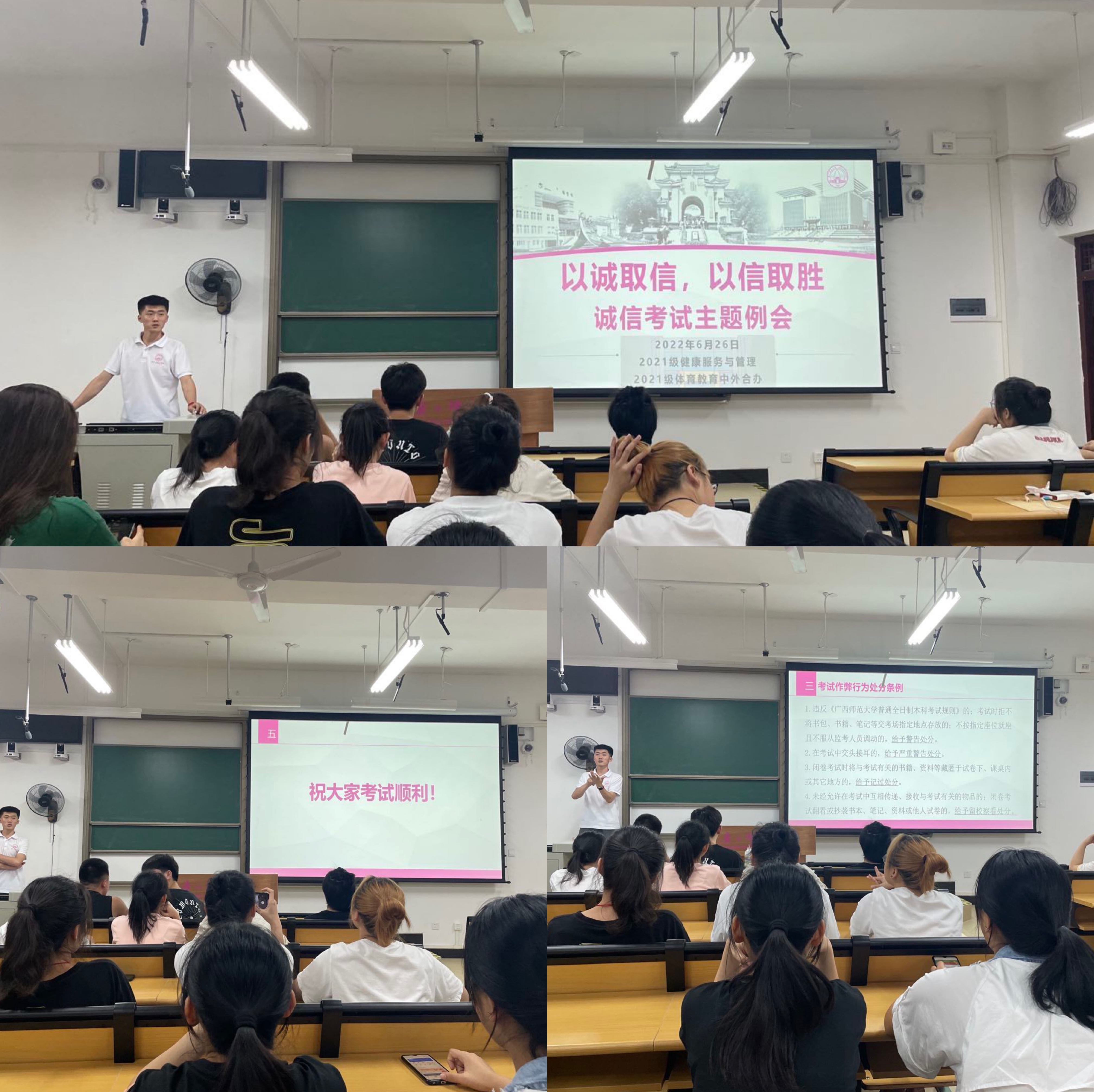 为引导同学们树立诚信应考理念、以积极向上状态迎接期末考试,学院本、研各年级在6月19日-26日开展了多种形式的诚信考试主题班会,通过违纪处理办法学习、案例警示、分享诚信应考感想等方式,让诚信学风深入到每位同学心中,树道德新风、立诚信根本。