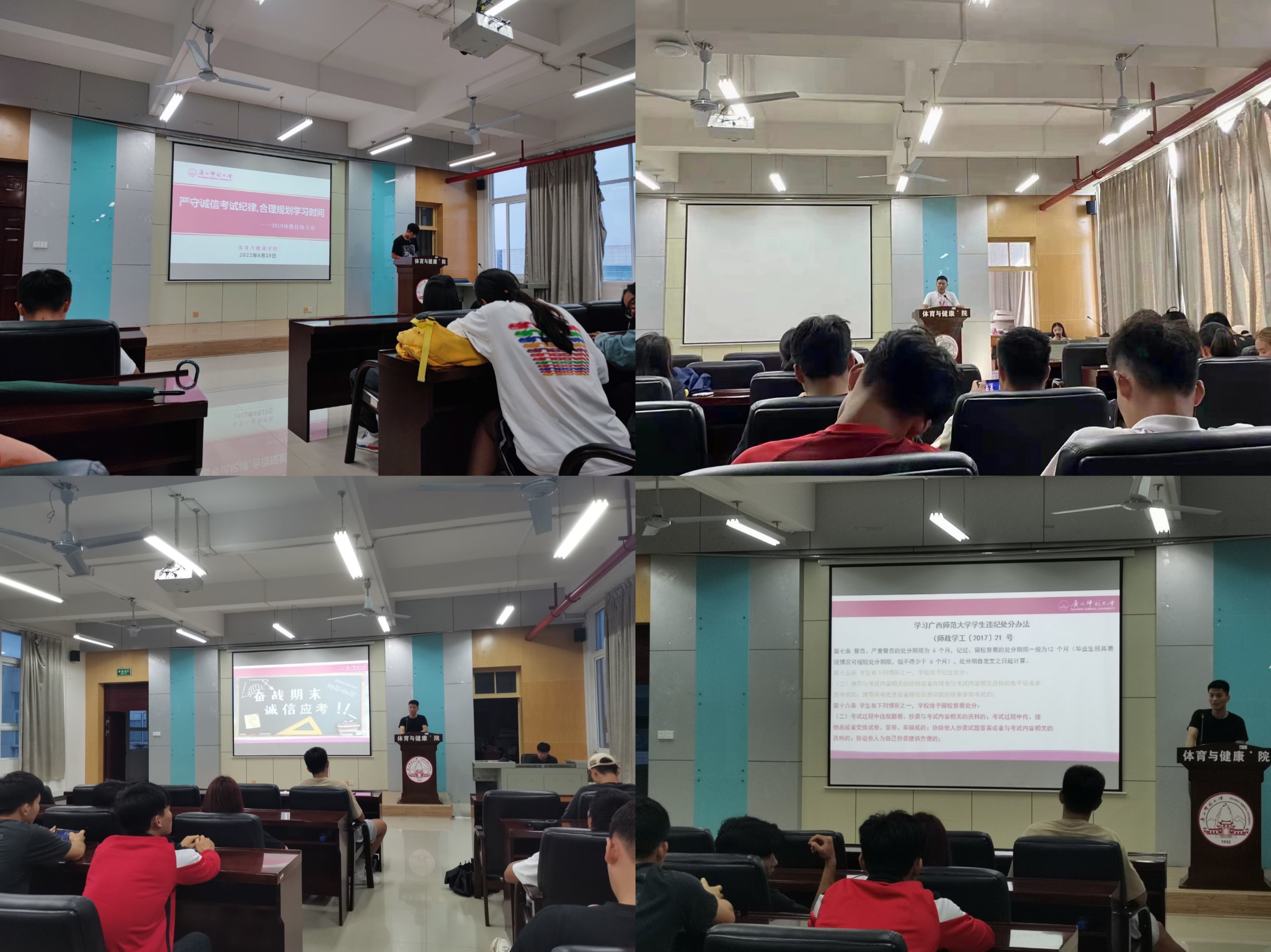 诚信考试作为学风建设的重要一环,体育与健康学院一直重视诚信考试教育。辅导员、学生党支部书记深入党支部、年级、团支部开展诚信考试教育宣传活动,有效引导了学生的思想和行为。学院以“领导巡考、教师监考、辅导员看考、研究生党员督考”的四位一体模式贯穿考试全程,切实严肃了考风考纪,营造“体健、好学、善思、力行”的良好学风。
