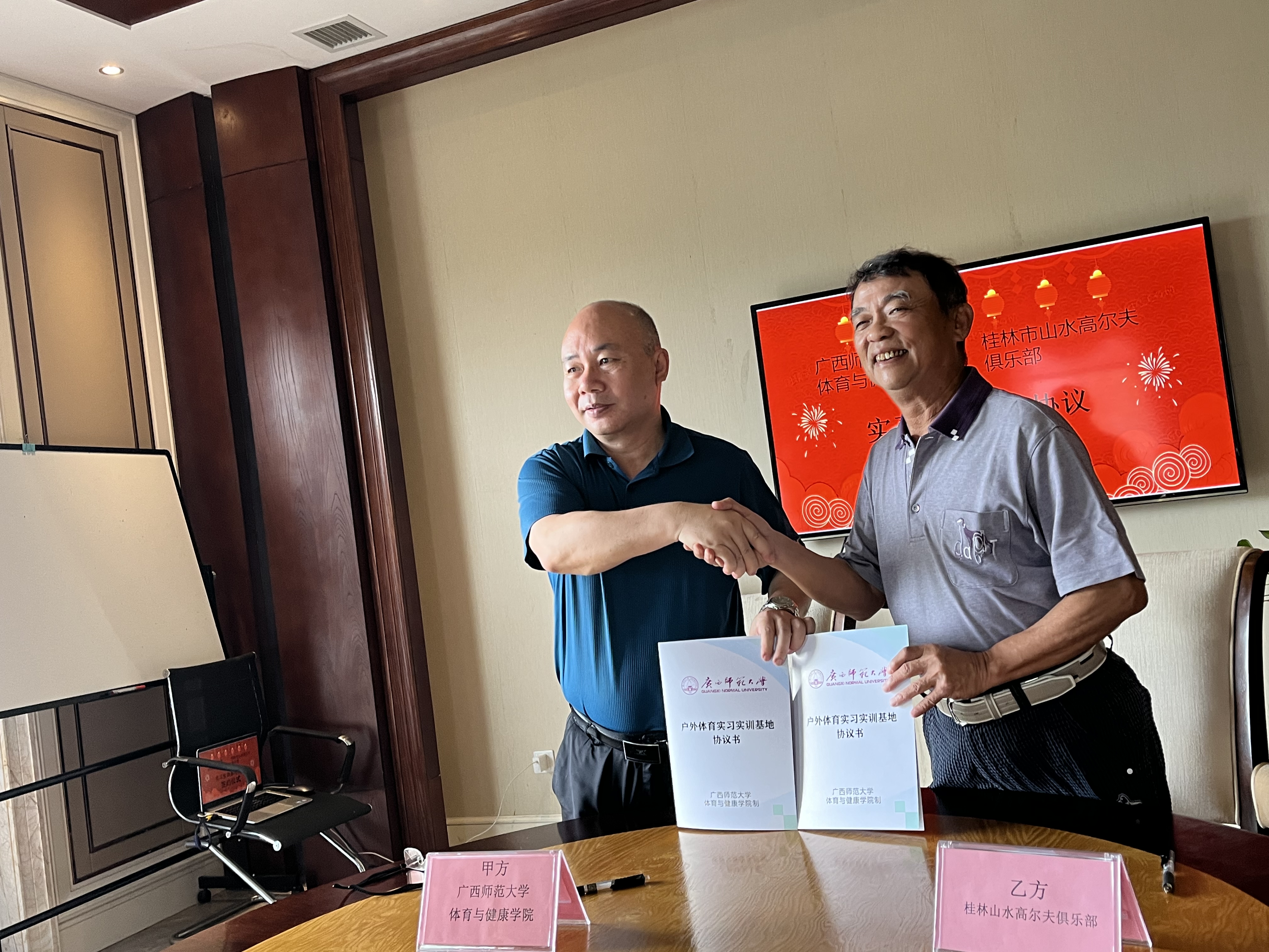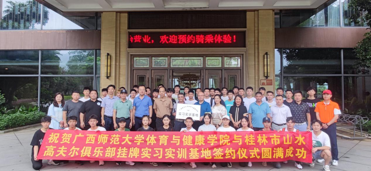 6月30日,体育与健康学院在桂林山水高尔夫俱乐部举行(实训)基地挂牌签约仪式,体育与健康学院负责人、教研室主任、社会体育指导与管理专业相关负责人、班主任、学院专兼职辅导员,桂林山水高尔夫俱乐部翁述正总经理等出席签约仪式。