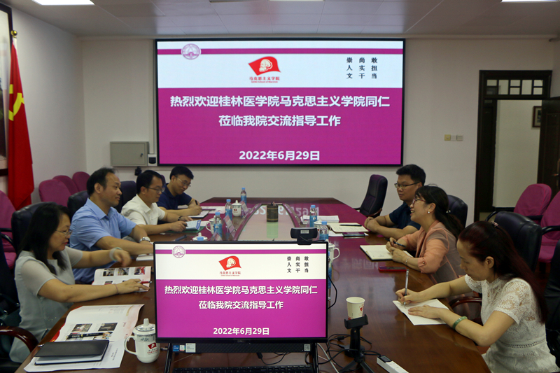 6月29日,桂林医学院马克思主义学院来我院交流,双方围绕青年教师教学能力提升、人才培养、学术交流、硕士点申报、联合培养兼职硕导等方面进行了广泛研讨,表示要进一步加强交流合作,推动资源共享,共同提升思政理课建设水平,推动马院高质量内涵式发展。