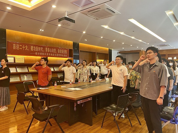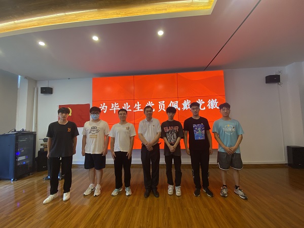 最后,学院党委负责人为毕业班党员代表佩戴党员徽章,全体毕业生党员们面向党旗,庄严宣誓,重温入党誓词。