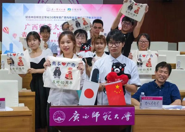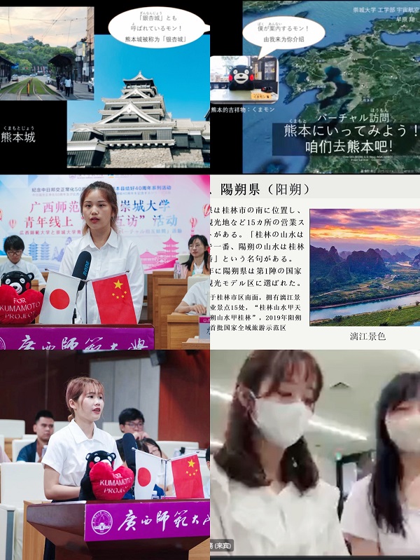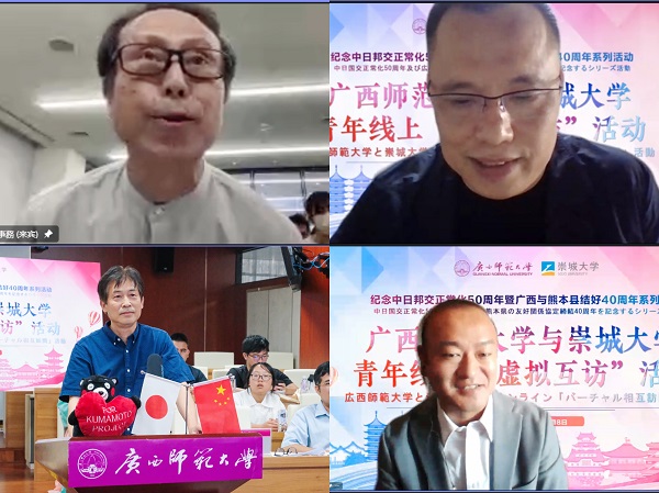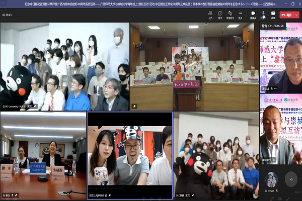 在广西壮族自治区人民对外友好协会、熊本县上海事务所的共同发起和支持下,7月8日,“纪念中日邦交正常化50周年暨广西壮族自治区与熊本县结好40周年—广西师范大学与崇城大学青年“虚拟互访”活动在线上成功举办。广西壮族自治区人民对外友好协会办公室负责人和熊本上海事务所、熊本县观光交流政策课、八代市国际课代表通过视频方式出席活动,广西师范大学和崇城大学40余名师生参加了活动。活动内容包括共叙广西与熊本县友谊,“云游”桂林、“云游”熊本、艺术作品展演、我校与崇城大学合作交流回顾、互动交流等。