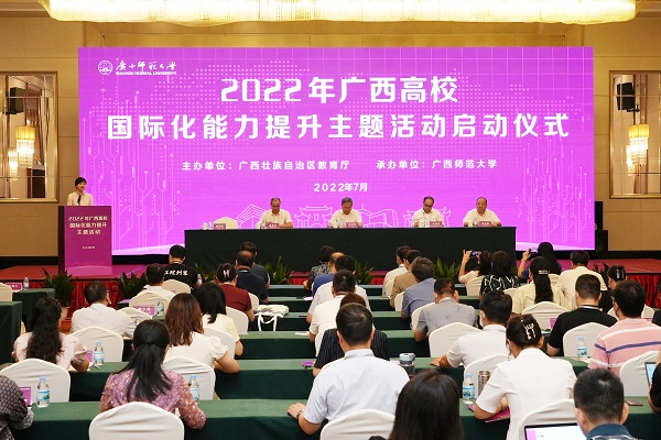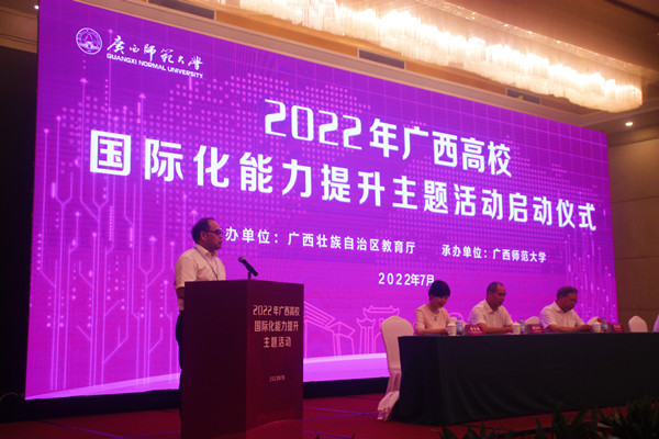 7月14日,2022年广西高校国际化能力提升主题活动启动仪式在桂林举行。本次主题活动由广西壮族自治区教育厅主办,广西师范大学承办,旨在深入贯彻落实《教育部等八部门关于加快和扩大新时代教育对外开放的意见》和《深化新时代教育评价改革总体方案》精神,引导高校把国际化理念融入各项工作当中,进一步提高来华留学、合作办学等工作质量,加快推进广西高等教育国际化进程。全区首批有34所高校参与实施国际化评价的试点,有关本科高校外事和教务部门负责人以及高职院校分管外事工作的校领导、外事部门负责人共70余人参加了此次主题活动。
