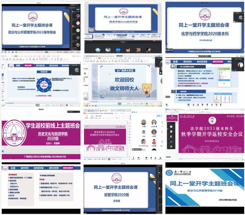 班会上,辅导员严把学校疫情防控要求,围绕《广西师范大学秋季学期学校开学相关工作的通知》《广西师范大学2022学年秋季学期学生返校须知》等具体文件通知要求对学生返校各项工作进行布置,各学院(部)各年级辅导员从返校安排以及返校后要求等相关注意事项为学生详细解读,并重点强调最新疫情防控要求、返校后校园管理相关的注意事项、返校后教学模式、核酸检测安排、用餐模式等,叮嘱学生知悉学校疫情防控具体要求。除此之外,对于暂缓返校的学生,辅导员耐心引导其按照疫情防控要求继续做好个人防护、遵守地方管理规定与学校相关管理规定,调适好心态,端正学习态度,积极参与线上学习与自主学习。同学们表示将自觉遵守学校返校要求及相关管理规定,服从学校日常管理,主动做好晨午检、核酸检测等安全防范措施。
