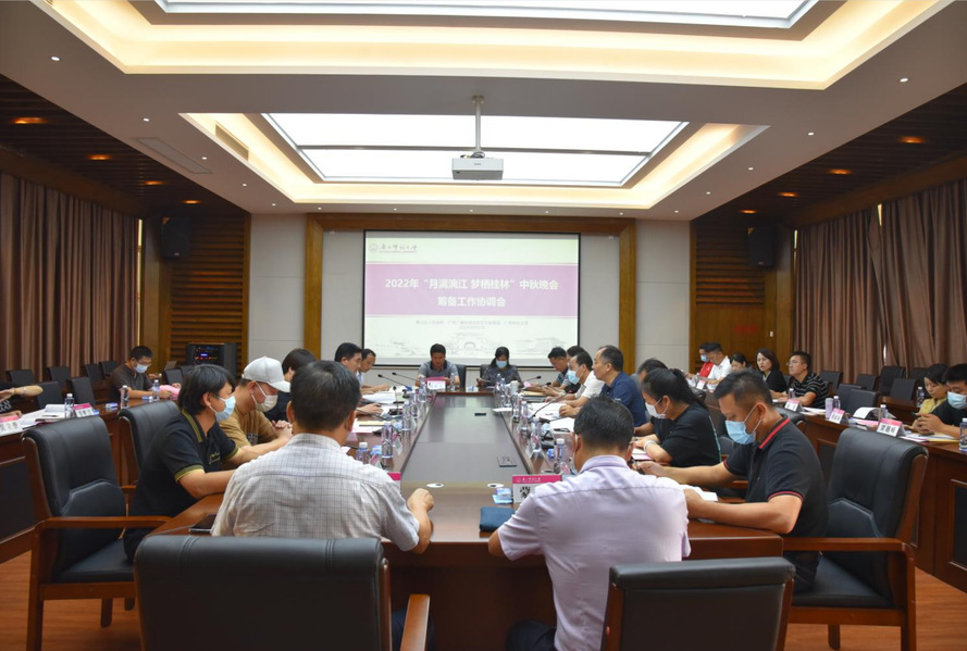 会上,雁山区人民政府区委副书记刘有文详细介绍了2022年“月满漓江 梦栖桂林”中秋晚会的背景,以及选择在我校举办的目的、意义。广西广播电视台综艺文旅频道导演覃煜智介绍了承接本次中秋晚会的导演执行团队情况,并就晚会各环节与我校相关单位作进一步协调沟通。