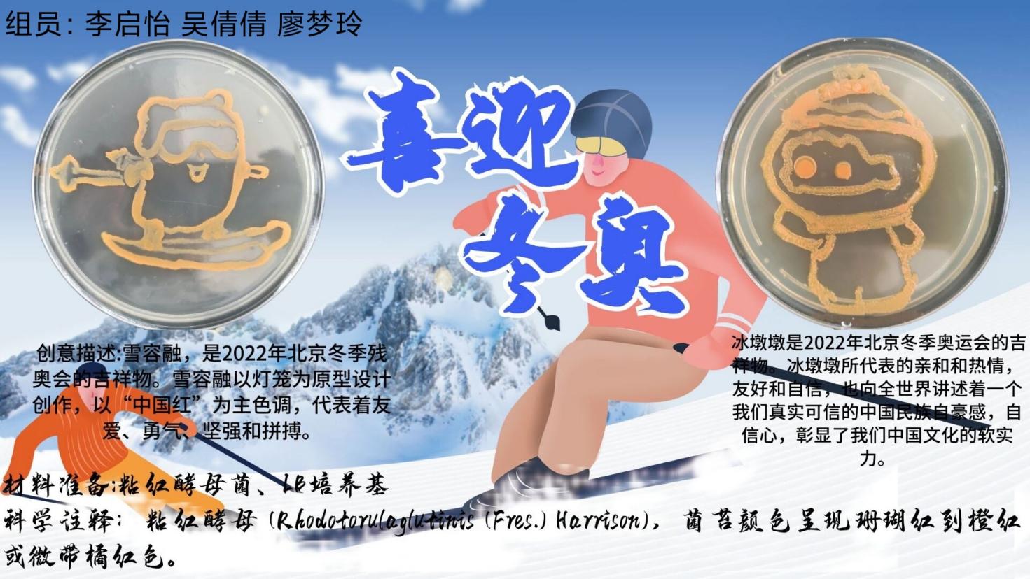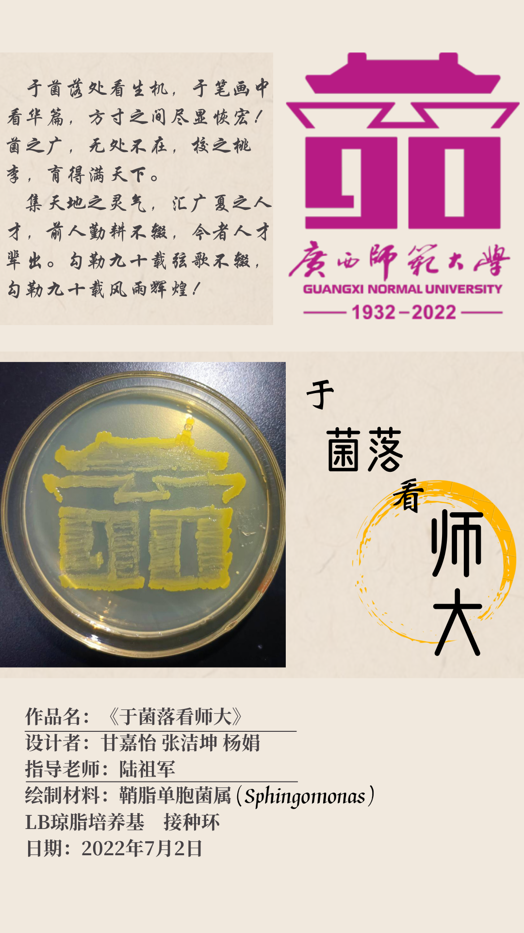 学院陆祖军教授从创作灵感、制作材料、制作过程、作品拍摄、海报制作、内涵挖掘等方面为参赛团队进行赛前培训。参赛团队在培养皿的方寸之地,用微生物构成的线条、画面展现在小小的培养皿中,有充满力量的拳头、有优秀榜样的形象、有美丽校园环境,各团队用小小的微生物展示了他们对红色精神的理解、对英雄榜样的敬意、对祖国对学校的无限热爱。