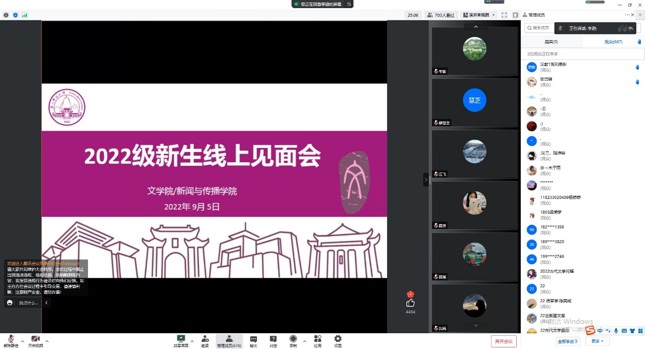 9月5日,文学院/新闻与传播学院通过腾讯会议的方式召开2022级新生线上见面会,欢迎2022级新同学的到来。学院党委负责人、学院学生工作负责人、学院团委相关负责人,2022级全体辅导员及全体本科、研究生新生参加见面会。