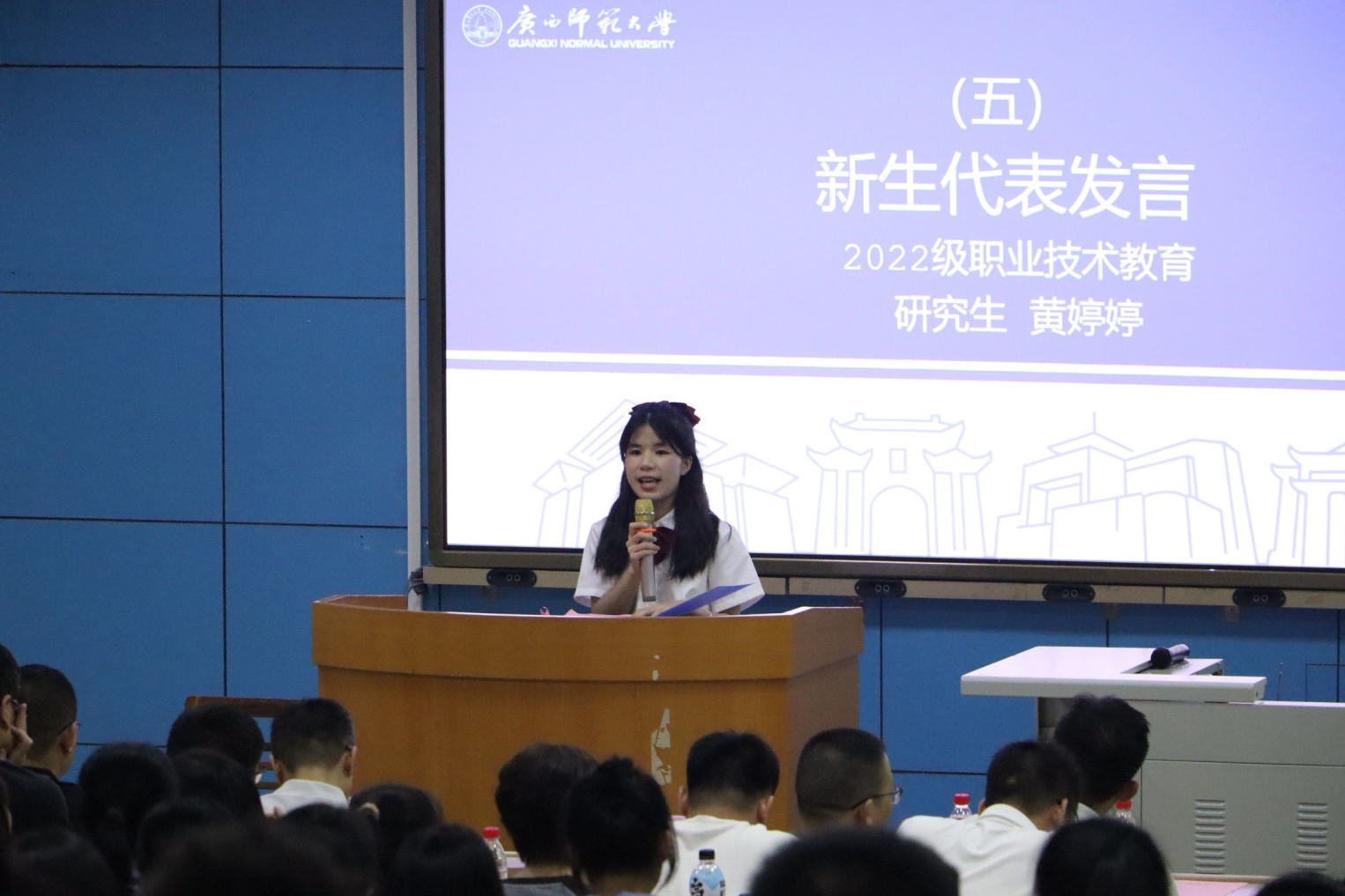 学院行政负责人代表学院全体师生向新生们表示热烈欢迎,她向全体新生介绍了职师学院近年来的发展概况,特别是在师资队伍建设、学科建设和专业发展、人才培养等方面取得的成绩成果。她对新同学们提出期待,作为新一代“职师人”,在职业教育快速高质量发展的新时代,要好好积极拥抱学习生活,感知发现身边一切美好的事物、美好的人,让生活充满热情和希望。珍惜一切学习的机会,把自己锻炼成为一个有责任、有担当、有情趣、有志向,品德高尚、学有专长、全面发展的国之栋梁。