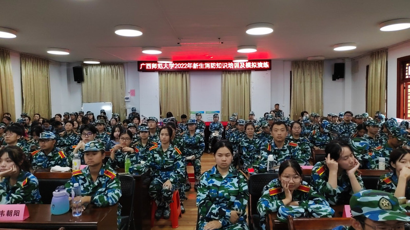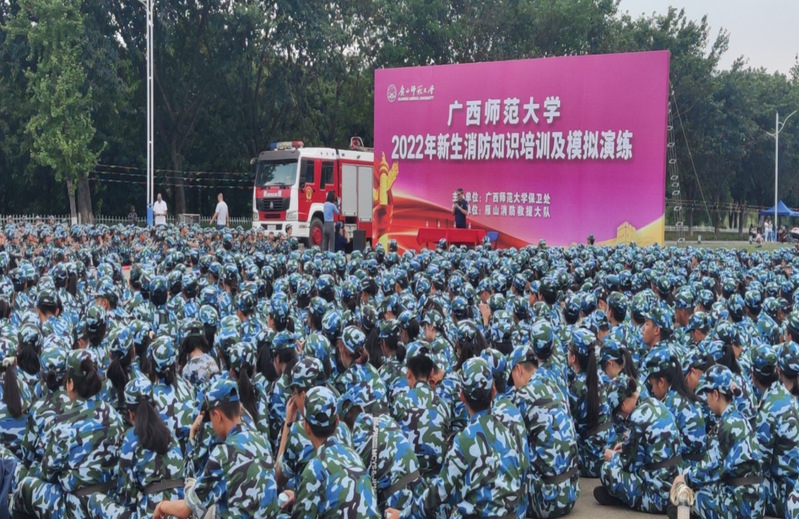 为切实抓好学校的消防安全教育工作,增强学生的安全防范意识,提高预防火灾和应对突发火灾的处置能力,上好“新生入学消防安全第一课”,9月21日-23日我校分三校区开展了新生消防知识培训及模拟演练活动。活动得到桂林市消防救援支队、七星区消防救援大队、秀峰区消防救援大队和雁山区消防救援大队的大力支持,派出官兵到场指导工作。参加本次活动的有保卫处消防干部队员、2022级全体新生、军训教官共7200余人。