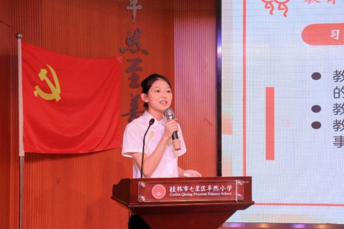 宣讲结束后,现场播放了两段卓然小学少先队代表在湘江战役纪念馆和龙胜红军岩,寻访红色基地、感悟党的精神主题队日活动视频。随后,18-2中队王韬峻同学向大家讲述了他有着六十多年党龄爷爷的英雄事迹,17-8中队王姿人同学用生动的语言描述了她的太爷爷与中国共产党共患难共成长的故事,17-7中队陈心如意同学向大家介绍了她心中的优秀共产党员—卓然小学校长叶琴珍老师的先锋事迹。