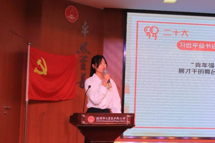 10月21日,历史文化与旅游学院团委联合研究生第三党支部走进桂林市卓然小学开展“青春献礼二十大,强国有我新征程”主题宣讲活动。学院团委负责人、研究生第三党支部师生代表、学院党的二十大精神宣讲团成员代表、学院第八期青马班成员代表、桂林市七星区卓然小学团支部、少先队师生代表共计80余人参与本次活动。