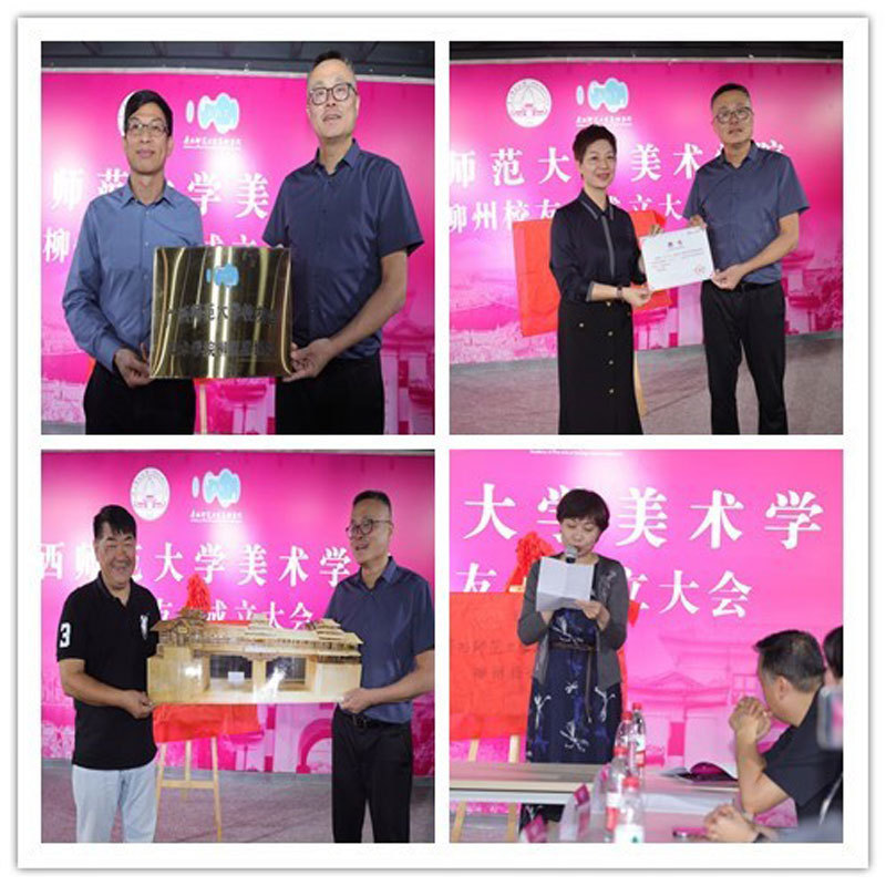 会上,学院纪委书记、副院长宣读成立广西师范大学校友会美术学院柳州联络处的批复。美术学院领导、校友代表共同为广西师范大学校友会美术学院柳州联络处揭牌。学院主要负责人为广西师范大学校友会美术学院柳州联络处组织成员颁发聘书,并向与会校友赠送校徽及文创作品;当选会长刘洪波代表与会校友向母校赠送礼物。