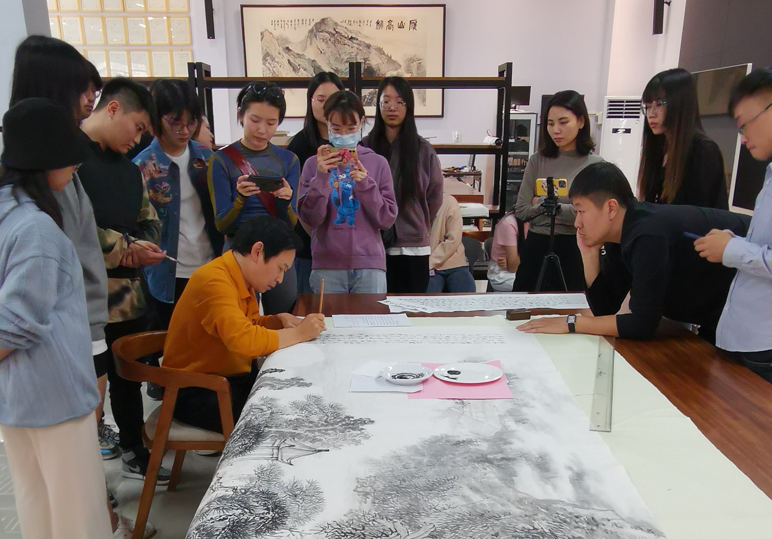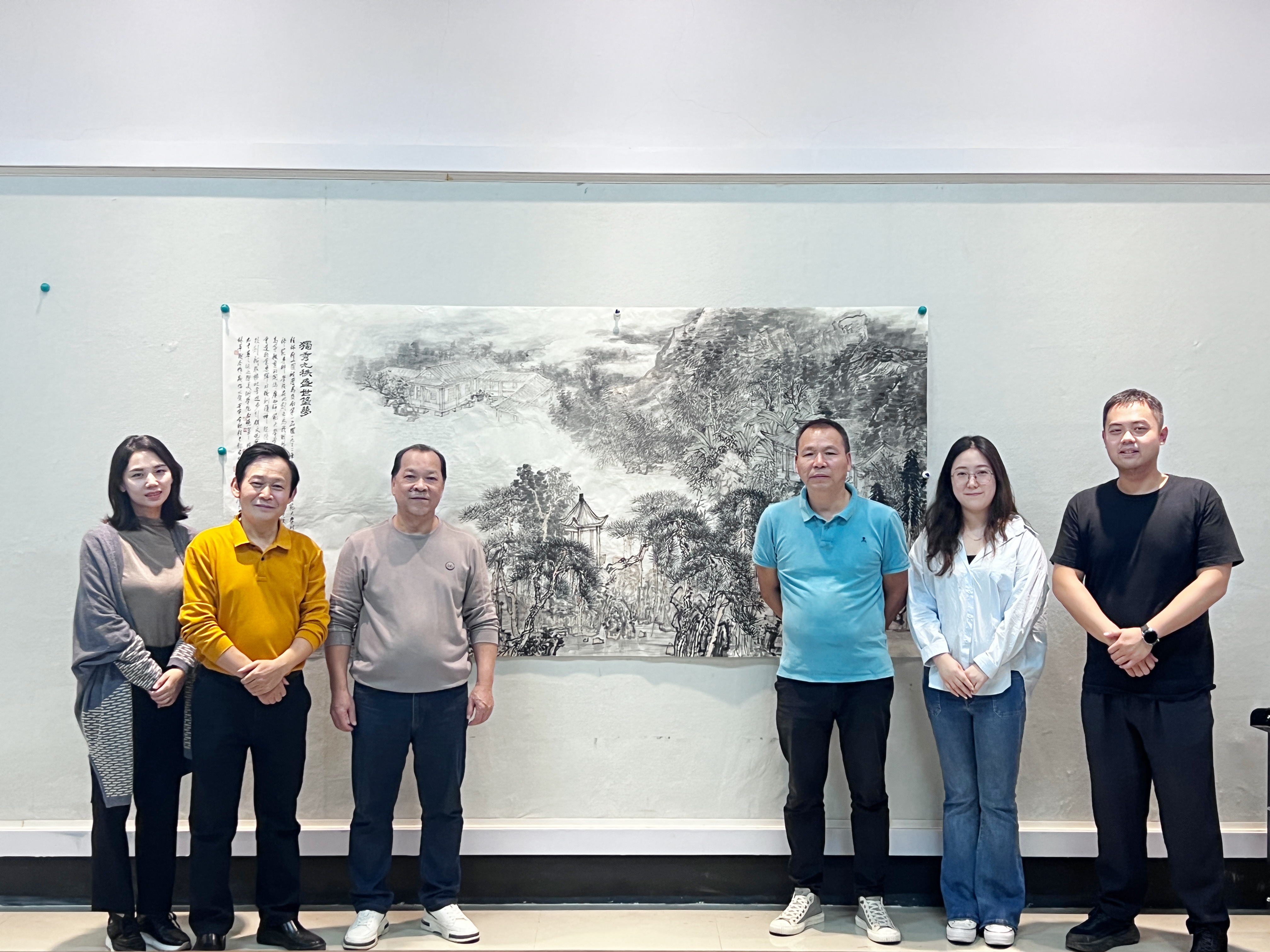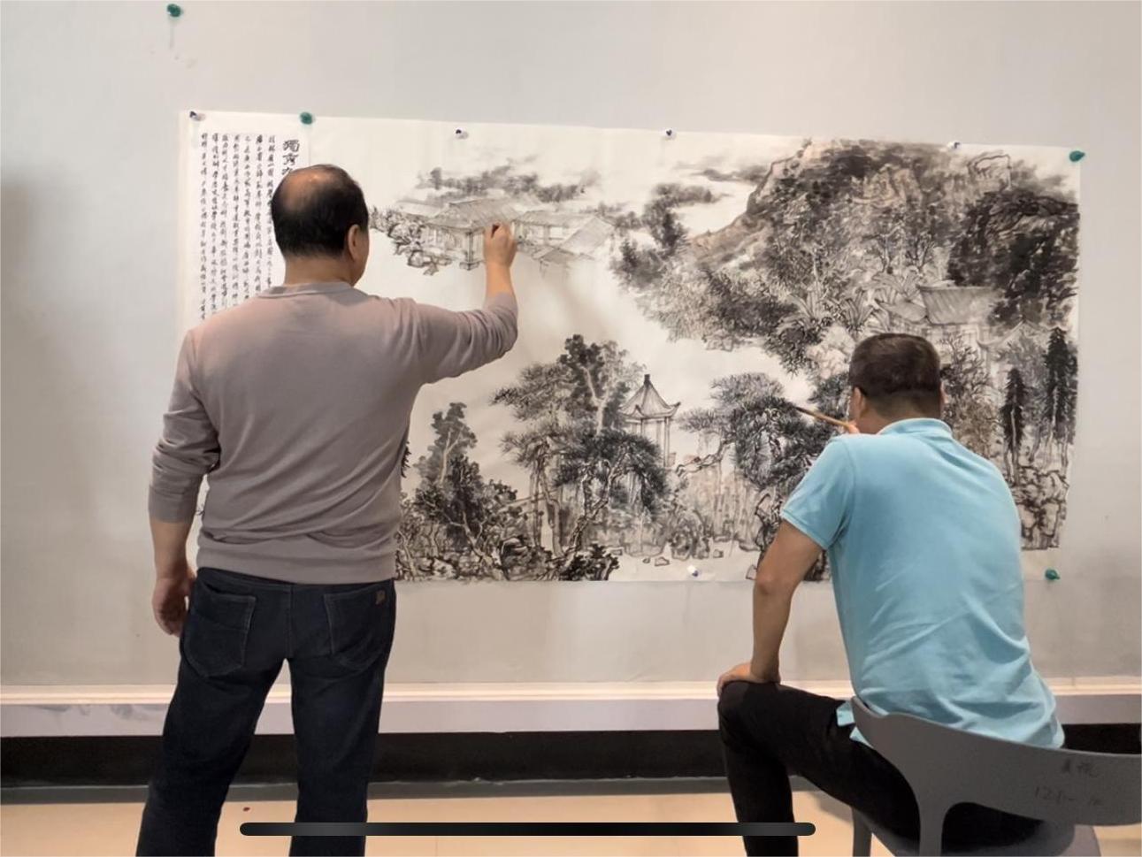 10月29日,美术学院教师白晓军、徐芳、刘宪标、孙洁、程辉、黄文祥、尹惠俊、白杨、林莘翔于美术学院东北亚艺术研究中心,共同合作创作了《独秀九秩 盛世筑梦》中国画主题作品献礼学校90周年校庆。