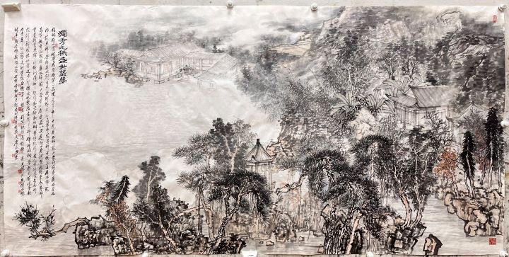 作品由美术学院陆丽娟教授撰写跋文,唐长兴教授题款,描绘了广西师范大学的前身,广西省立师范专科学校创始地,被誉为“岭南第一名园”的桂林雁山园的秀美风景。创作组对桂林雁山园进行了深入考察、调研、写生,与历史文脉进行了跨时空对话,对岭南园林中的文化精神内涵加以发掘,将桂林的山之秀、水之奇、树之异与桂林雁山园的文化历史相结合融入到艺术创作中。