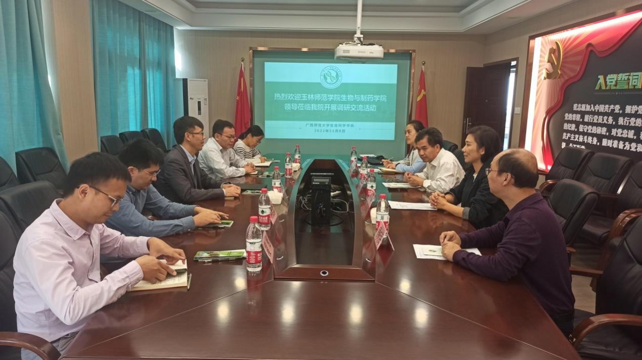 11月8日,玉林师范学院生物与制药学院贝永建副院长带队到生命科学学院、珍稀濒危动植物生态与环境保护教育部重点实验室进行调研交流。生命科学学院党政主要负责人携班子代表参加调研活动。