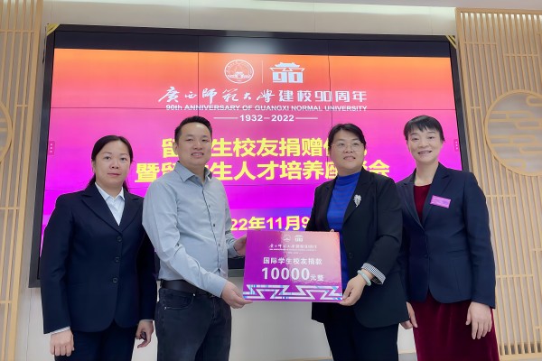 在捐赠仪式上,国际文化教育学院党委负责人和历史文化与旅游学院党委负责人共同为黄文宣校友颁发捐赠证书。国际文化教育学院党委负责人代表学校向黄文宣校友表示感谢,也欢迎黄文宣校友回到母校继续攻读博士学位。她指出,中越两国人民的友谊渊源流长。越共中央总书记阮富仲成为中共二十大之后第一位对中国进行正式访问的外国领导人,此行加深了中越两国的友谊和合作。希望黄文宣学有所成,助力中越两国建设更紧密合作关系。黄文宣动情地回忆了他在母校度过的求学时光,正是在广西师范大学求学的那段时光,为他的事业以及人生打下了坚实的基础,感恩母校,特别是感恩学院的领导老师们对他的培养。