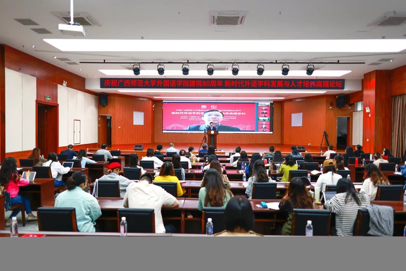 踔厉奋发八十载,笃行致远谱新篇。11月10日,由广西师范大学主办的“新时代外语学科发展与人才培养高端论坛”在育才校区举办。此次论坛是广西师范大学90周年校庆,外国语学院80周年院庆的系列学术活动之一,邀请到了国内高校16位知名专家做学术报告,与会学者围绕新时代外语学科发展与人才培养从多个方面展开交流研讨。100余名师生在报告厅现场,与腾讯会议直播室的线上听众一起聆听了报告。