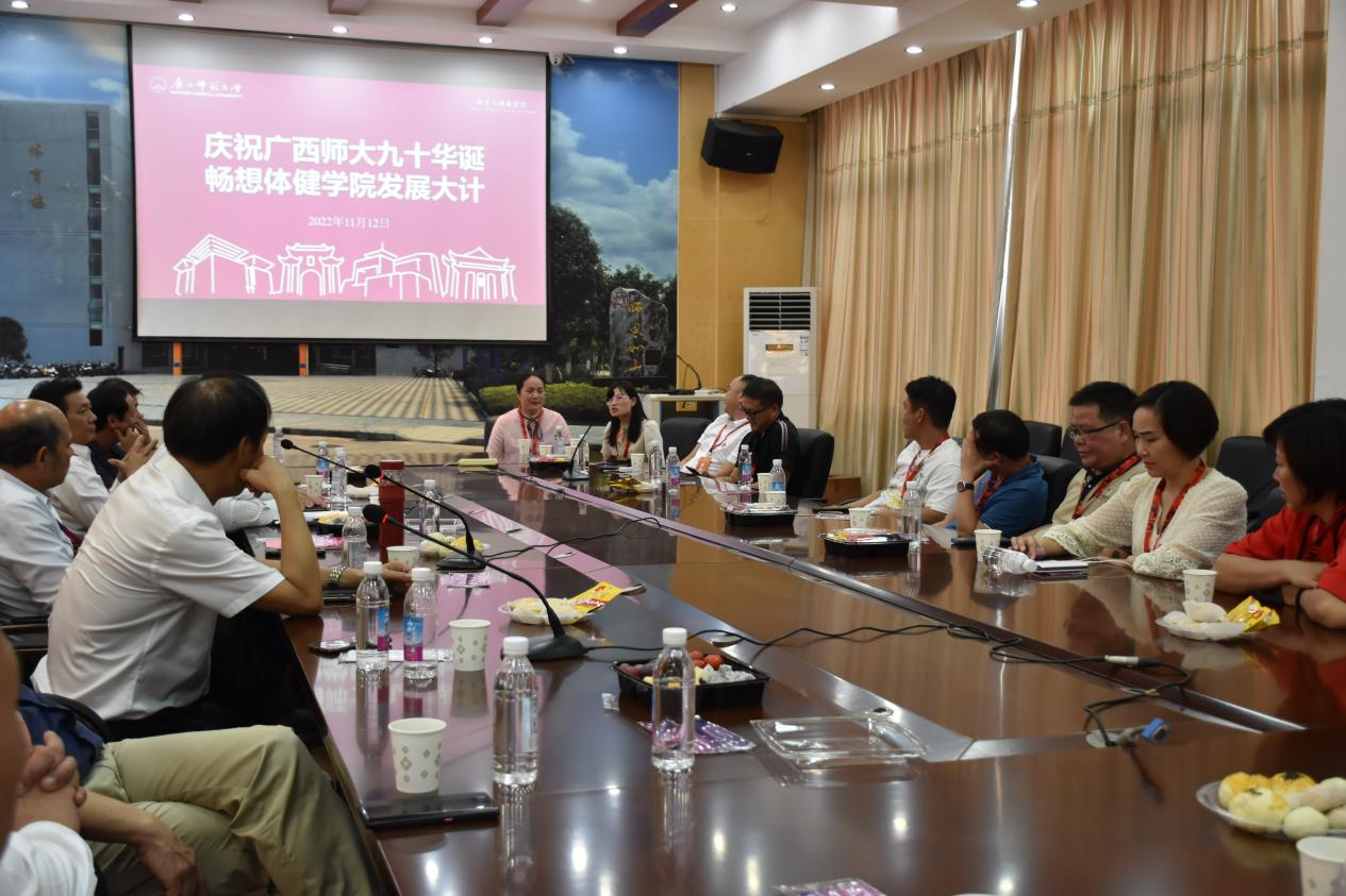 九秩春秋,弦耕不辍育桃李芬芳;济济多士,薪火相传书体健华章。值广西师范大学建校九十周年校庆庆典之际,分散在全国各地的优秀校友们受邀回到母校。11月12日下午,体育与健康学院举办“庆祝广西师大九十华诞 畅想体健发展大计”校友座谈会。回校参加庆典校友、学院老领导、体育与健康学院党政领导班子出席座谈会,会议由学院行政主要负责人主持。