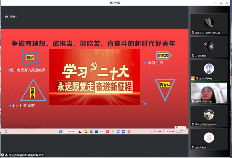 为深入学习贯彻党的二十大精神,11月25日,广西师范大学《共产党宣言》青年研习社通过线上形式开展“学习二十大、永远跟党走、奋进新征程”——21天理论学习打卡活动中期学习分享会,来自各学院(部)的230名同学参与了此次活动。