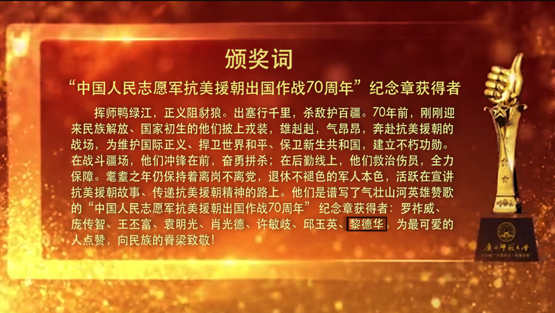 点赞团体:“中国人民志愿军抗美援朝出国作战70周年”纪念章获得者:罗祚威、庞传智、王丕富、袁明光、肖光德、许敏歧、邱玉英、黎德华。