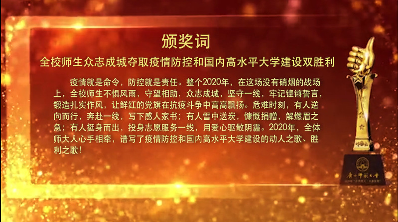 2020年初,新冠肺炎疫情来势汹汹,关键和危机时刻,学校闻令而动,迅速成立疫情防控领导小组和疫情防控指挥部,全体人员勇挑重担,身先士卒,始终坚守防疫第一线,用使命和担当构筑起学校疫情防控坚固堡垒,用初心和温情守护了全体师生员工的身体健康和生命安全,有力确保了学校正常开学和各项工作稳定运行。无数师生投身一线,积极配合疫情防控工作,防控办、机关、保卫、后勤、医疗、社区、各学院(部)各单位各战线全员动员,共同抗击疫情,无数师生参与志愿服务,跨国跨地区慷慨捐赠,用爱心和奉献温暖校园,谱写了疫情防控和国内高水平大学建设双胜利之歌!