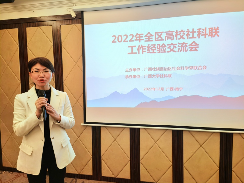12月16日,由广西社科联主办,广西大学社科联承办的2022年全区高校社科联工作经验交流会在南宁市召开,会议由广西社科联韦杰副主席主持,全区各高校社科联相关领导及负责人出席了会议。我校作为高校社科联代表在会上作了典型发言。