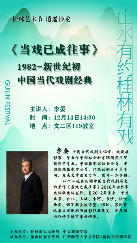 12月14日,桂林艺术节逍遥沙龙系列讲座《当戏已成往事》在我校雁山校区文2-119报告厅举行。中国摄影家协会成员、中国新闻摄影学会员李晏作主题分享,文学院/新闻与传播学院近200名本科生现场聆听。
