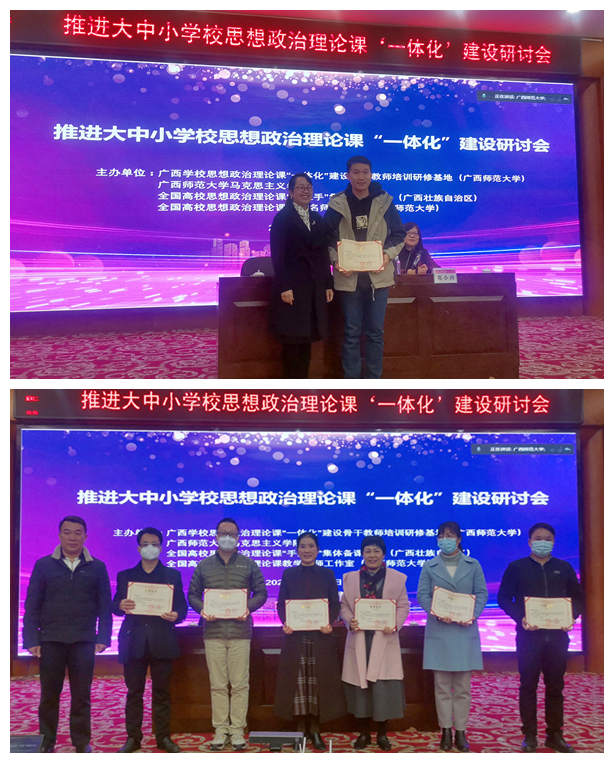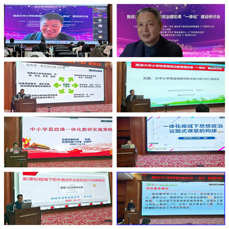 为学习贯彻党的二十大精神,落实习近平总书记在学校思想政治理论课教师座谈会上的重要讲话精神,统筹推进大中小学思政课一体化建设,探讨不同学段思政课教学如何循序渐进、螺旋上升,实现各学段教学工作的高度契合和科学衔接,促进思政课建设内涵式发展。 2022年12月14日,由广西学校思政课“一体化”建设骨干教师培训与研修基地(广西师范大学)、广西师范大学马克思主义学院、全国高校思政课“手拉手”集体备课中心(广西壮族自治区)、全国高校思政课教学名师工作室(广西师范大学)共同主办的“推进大中小学校思想政治理论课“一体化”建设”研讨会在桂林举行,研讨会以线上线下相结合方式进行,约60名中小学思政课教师参加了研讨会。