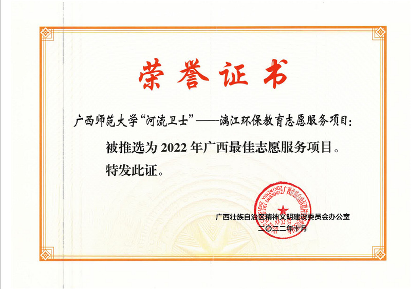 近期,在自治区文明办开展的广西学雷锋志愿服务先进典型宣传推选活动中,由我校团委指导选送的“研究生支教团”“河流卫士——漓江环保教育志愿服务项目”分别获评“最佳志愿服务组织”及“最佳志愿服务项目”。我校系本届评选活动唯一兼获两项荣誉的高校单位。