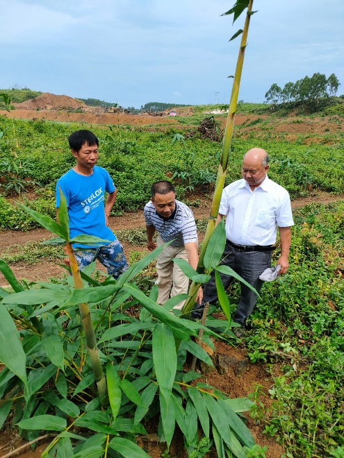 在广西桂平市木圭镇金垌村有一大片采矿废墟地,无树木、植被,生态环境差,水土流失严重。自治区科技特派员、广西师范大学生命科学学院教授邓荫伟受木圭镇四德村村民、致富带头人李学华邀请前往调研、探讨,希望能找到一条既能绿化治理环境又能创造效益的产业发展之路。经到多地调研与考察,选定发展笋用竹产业,种植麻竹品种。2021年春,李学华成立了“桂平市竹海种养专业合作社”,同时邓荫伟请来广西林科院徐振国专家,共同研究基地的建设问题。2021年1月动工,同年4月完成了一期工程1600亩造林,2022年春季完成二期工程1400亩造林。
