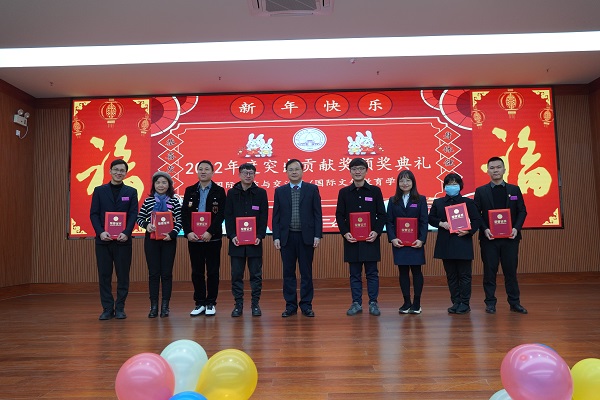 苏桂发充分肯定了国际交流与合作工作取得的成绩,希望全体教职工2023年继续鼓足干劲、勇毅前行,推动学校教育对外开放工作再上新台阶,并提出了三点建议:一是要坚定不移推进学校教育对外开放;二是要不断推动我们的工作融入国家发展大局;三是要积极构建多层次、多领域、多形式的教育交流合作机制。苏桂发为获得年度突出贡献奖的个人和团队颁奖。孟凡璧、黄海林、李冬梅、吕芳、罗超、覃元姣、焦小玲、李芳、王雪、李浩宇、罗军等11人荣获个人突出贡献奖;外国专家与留学生服务中心、国际学生招生团队和《大学生创业英语》区级一流课程团队获得团体突出贡献奖。