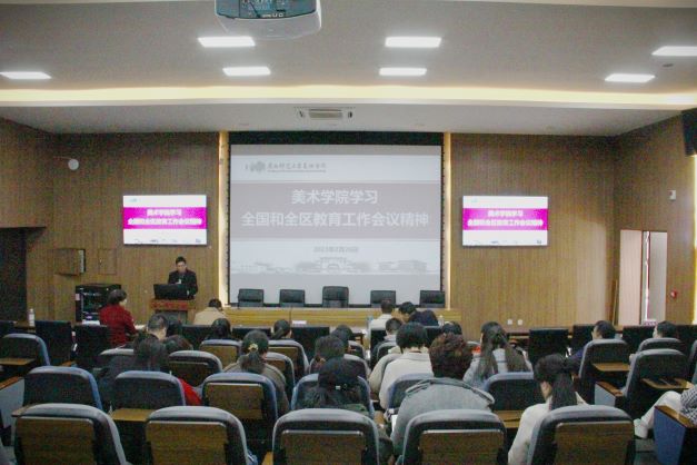 2月26日上午,美术学院在纯道楼001报告厅召开专题会议,学习传达全国和全区教育工作会议精神。学院领导班子、全体教职工参加本次会议,会议由学院党委主要负责人主持。