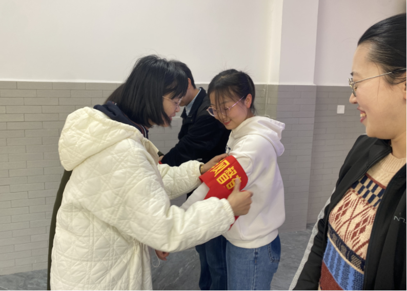 为研究生党员志愿者代表佩带袖标