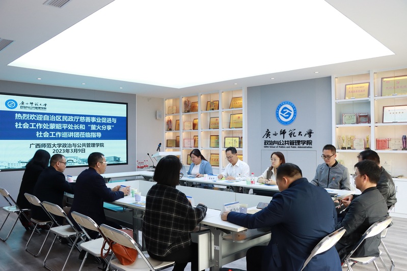 为深入贯彻落实新时代党的建设总要求和新时代党的组织路线,进一步推进全国“双带头人”教师党支部书记工作室,做好党建示范创建和质量创优工作,3月9日,广西民政厅慈善事业促进与社会工作处蒙昭平处长和“萤火分享”社会工作巡讲团一行到政管学院开展党建工作交流座谈,学院行政相关负责人、社会学与社会工作系主任、社会学与社会工作系教工党支部书记及部分支部成员参加了交流座谈。